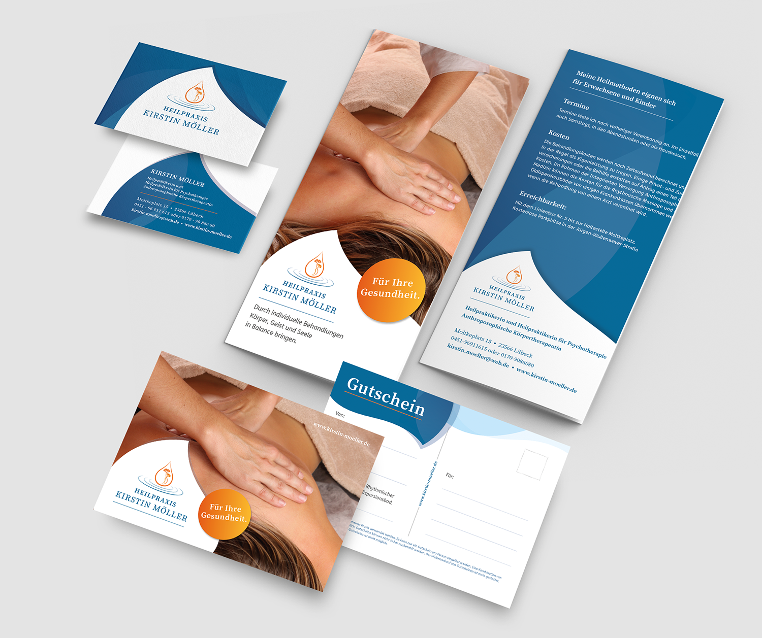 Logoentwicklung und gestaltung eines Corporate Design für Visitenkarten, Flyer, Anzeigen,Gutscheine, Praxis-Beschilderung und Fensterbeklebung