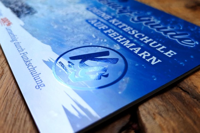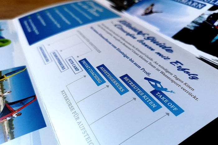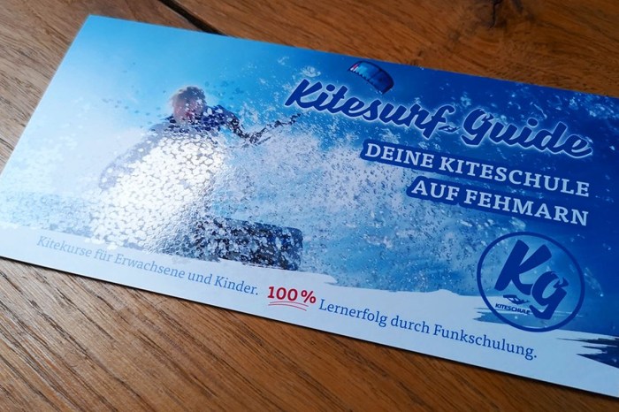 Entwicklung und Gestaltung eines Imageflyer für Kitesurf-Guide – Deine Kiteschule auf Fehmarn. Veredelt mit partiellem UV-Spotlack.
